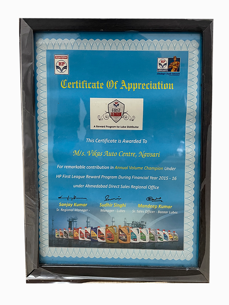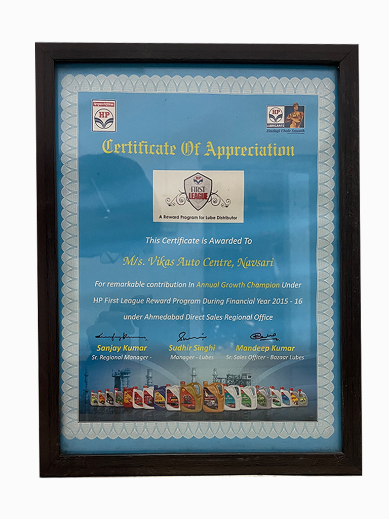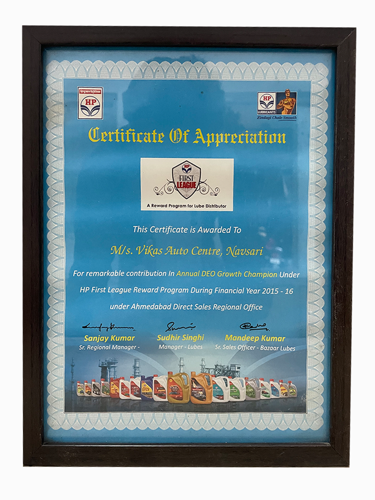 We VARDHMAN OIL AGENCY is Authorized C & F Agent of HPCL (Hindustan Petroleum Corp Ltd) India’s largest lube marketer to sale HPCL Brands of Industrial Lubricants in Navsari, Olpad (Surat Rural), and Tapi District, State Gujarat India and our other firm named VIKAS AUTO CENTRE is authorized Distributor to sale HPCL brands of Automotive lubricants and grease to Navsari,Vapi,Valsad area in Gujarat.India.